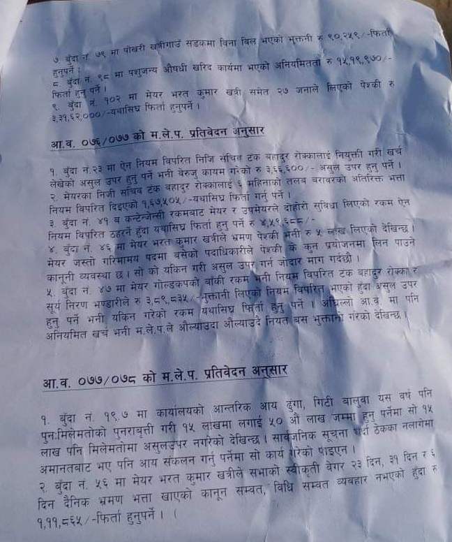 महालेखाको प्रतिवेदनले नगर प्रमुख भरत कुमार खत्रीले दोहोरो सुविधा लिएको, फर्जी विल पेश गरेको, दोहोरो भुक्तानी लिएको, ढुंगा, गिटि, बालुवा निकासीको ठेक्कामा अनियमितता गरेको जस्ता दर्जनौ शीर्षकमा बेरुजु देखाएको छ । नगर प्रमुखका स्वकीय सचिव टंक रोक्का र केही भित्रिया कर्मचारीले मेयर गोल्डकपको नाममा ठूलै तर मारेका छन । मेयरका स्वकीय सचिव रोक्काको नाममा मेयर गोल्डकपको शीर्षकमा मात्र करिव ४५ लाख बेरुजु प्रतिवेदनले देखाएको छ ।