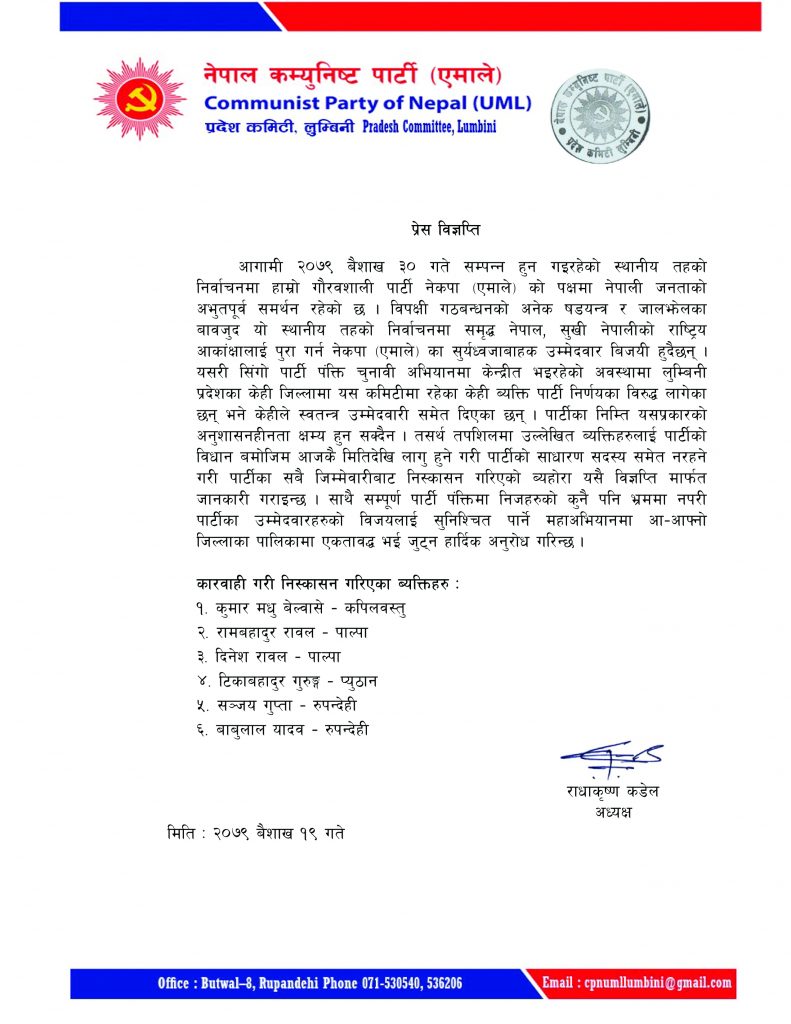 एमाले लुम्बिनी प्रदेश कमिटीका अध्यक्ष राधाकृष्ण कंडेलले सोमबार विज्ञप्ति जारी गरी ६ जनालाई पार्टीको साधारण सदस्य समेत नरहने गरी निष्काशन गरिएको बताएका हुन् ।
