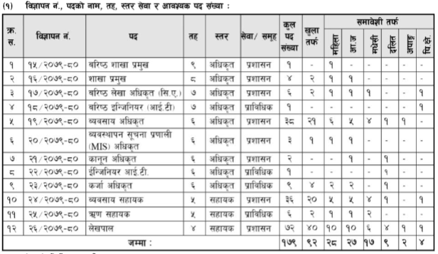 बैंकले प्रशासनतर्फ लेखापाल सहायक ७२ जना, प्रशासनतर्फ व्यवसाय सहायक ३६ जना र प्राविधिकतर्फ ऋण सहायक ६ जना माग गरेको छ । यस्तै कर्जा अधिर्कत ९, आईटी इन्जिनियर १, कानूनी अधिकृत २, व्यवस्पापक सूचना प्रणाली अधिकृत ३, व्यवसाय अधिकृत ३८ र आईटीतर्फ वरिष्ठ इन्जिनियर १ जना माग गरेको छ। यस्तै वरिष्ठ लेखा अधिकृत (सीए) ६, शाखा अधिकृत ४ र वरिष्ठ शाखा प्रमुख एकजना माग गरेको छ।