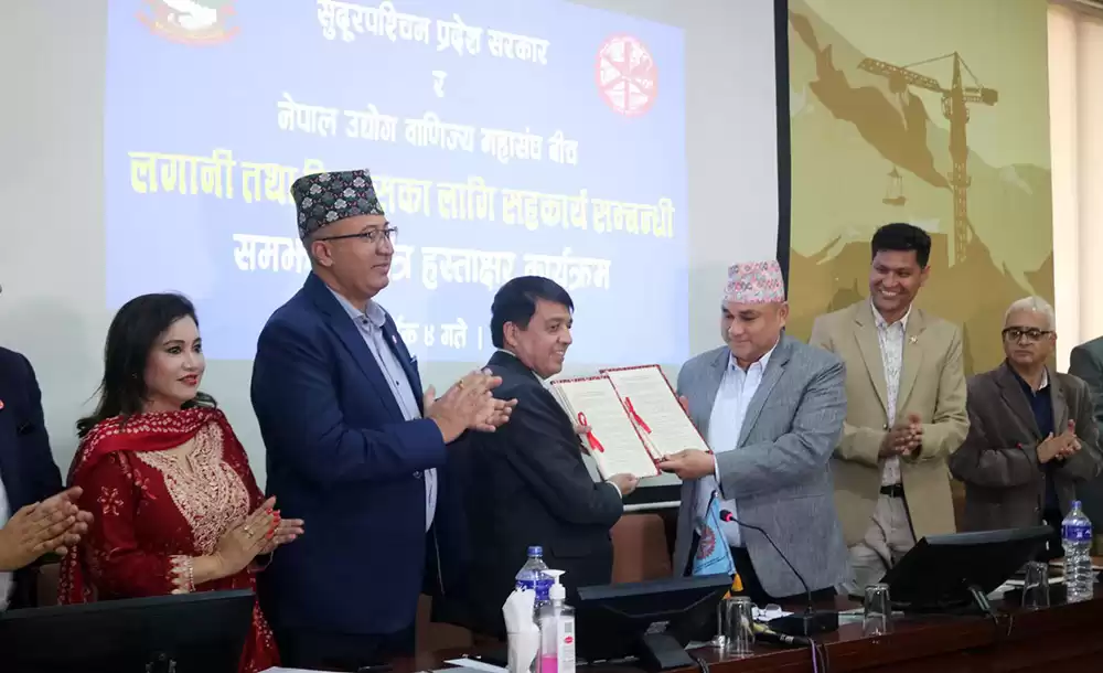 काठमाडौँ । सुदुरपश्चिम प्रदेश सरकार र नेपाल उद्योग वाणिज्य महासङ्घबीच लगानी प्रवद्र्धन र बिकासका गतिविधि सञ्चालनका लागि सहकार्य गर्ने बिषयमा समझदारी भएको छ । आज महासङ्घमा आयोजित एक कार्यक्रममा सदुरपश्चिम प्रदेशका मुख्यमन्त्री कमलबहादुर शाह र महासङ्घका अध्यक्ष चन्द्रप्रसाद ढकालले सझदारीपत्रमा हस्ताक्षर गरे ।