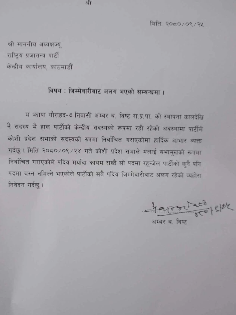 पार्टी केन्द्रीय कार्यालयलाई लेखेको पत्रमा भनिएको छ, ‘मिति २०८०।०९।२४ गते कोशी प्रदेश सभाले मलाई सभामुखको रूपमा निर्वाचित गराएकोले पदीय मर्यादा कायम राख्दै सो पदमा रहुन्जेल पार्टीको कुनै पनि पदमा बस्न नमिल्ने भएकोले पार्टीको सबै पदीय जिम्मेवारीबाट अलग रहेको ब्यहोरा निवेदन गर्दछु ।’
