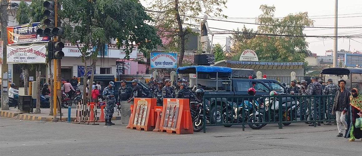 काठमाडौं । वीरगन्ज महानगरपालिका क्षेत्रमा साँझ ५ बजेपछि कर्फ्यु लागेपछि सुरक्षा व्यवस्था कडा पारिएको छ । दुई समुदायबिच द्वोन्द्वको अवस्था सिर्जना हुन नदिनका लागि त्यस क्षेत्रमा सुरक्षा परिचालन गरिएकोजिल्ला प्रशासन कार्यालय पर्साले जानकारी दिएको हो ।