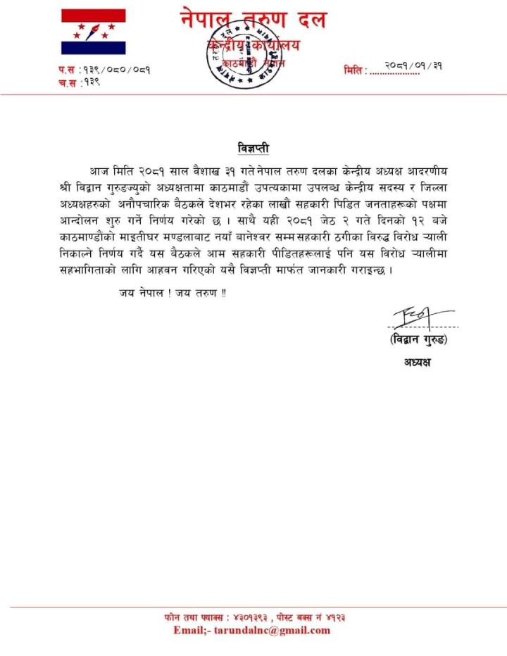 यस्तै तरूण दलले काठमाडौंको बत्तिसपुतलीमा सोमबार केन्द्रीय समिति बैठक गरेको छ । वैठकपछि अध्यक्ष विद्वान गुरूङले विज्ञप्ति जारी गर्दै सहकारी पीडित जनताका पक्षमा आन्दोलन सुरू गर्ने निर्णय भएको उल्लेख गरेका छन् । ‘जेठ २ गते मध्याह्न काठमाडौंको माइतीघरदेखि नयाँ बानेश्वरसम्म सहकारी ठगीविरूद्ध विरोध र्याली गर्ने निर्णय गरिएको छ,’ अध्यक्ष गुरूङले भनेका छन् ।
