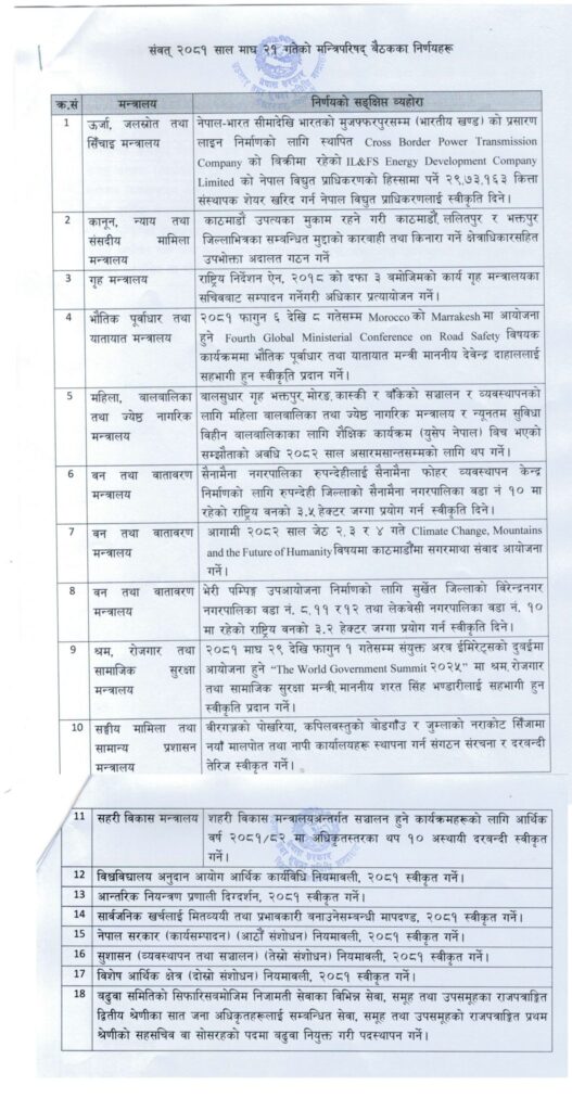 यस्तै बैठकले सहरी विकास मन्त्रालयअन्तर्गत सञ्चालन हुने कार्यक्रमका लागि चालू आर्थिक वर्षमा अधिकृत स्तरका थप १० अस्थायी दरबन्दी स्वीकृत गर्ने निर्णय गरेको छ भने विश्वविद्यालय अनुदान आयोग आर्थिक कार्यविधि नियमावली, २०८१, आन्तरिक नियन्त्रण प्रणाली दिग्दर्शन, २०८१, विशेष आर्थिक क्षेत्र (दोस्रो संशोधन) नियमावली २०८१ स्वीकृत गरेको छ ।