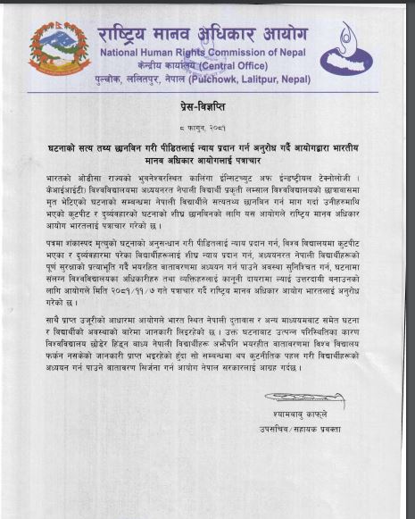 काठमाडौं । राष्ट्रिय मानवअधिकार आयोगले भारतको ओडीसा राज्यको भुवनेश्वरस्थित कालिंगा ईन्सिटच्युट अफ ईन्डष्ट्रीयल टेक्नोलोजी (केआईआईटी) विश्वविद्यालयमा अध्ययनरत नेपाली विद्यार्थी प्रकृति लम्साल विश्वविद्यालयको छात्रावासमा मृत भेटिएको घटनाको सम्बन्धमा ध्यानाकर्षण भएको जनाउँदै भारतको राष्ट्रिय मानवअधिकार आयोगलाई पत्राचार गरेको छ ।