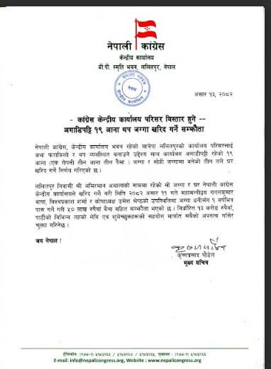ललितपुर निवासी अमिरमान अमात्यको नाममा रहेको सो जग्गा र घर नेपाली कांग्रेस केन्द्रीय कार्यालयले खरिद गर्ने गरी मिति २०८२ असार ११ गते महामन्त्रीद्वय गगनकुमार थापा, विश्वप्रकाश शर्मा र कोषाध्यक्ष उमेश श्रेष्ठको उपस्थितिमा जग्गा धनीसँग १ वर्षभित्र पास गर्ने गरी ५० लाख रुपैयाँ बैना सहित सम्झौता भएको छ । निर्धारित १३ करोड रुपैयाँ, पार्टीको विभिन्न तहको लेवि एवं शुभेच्छुकहरूको सहयोग मार्फत सबैको अपनत्व गाँसेर चुक्ता गरिनेछ ।