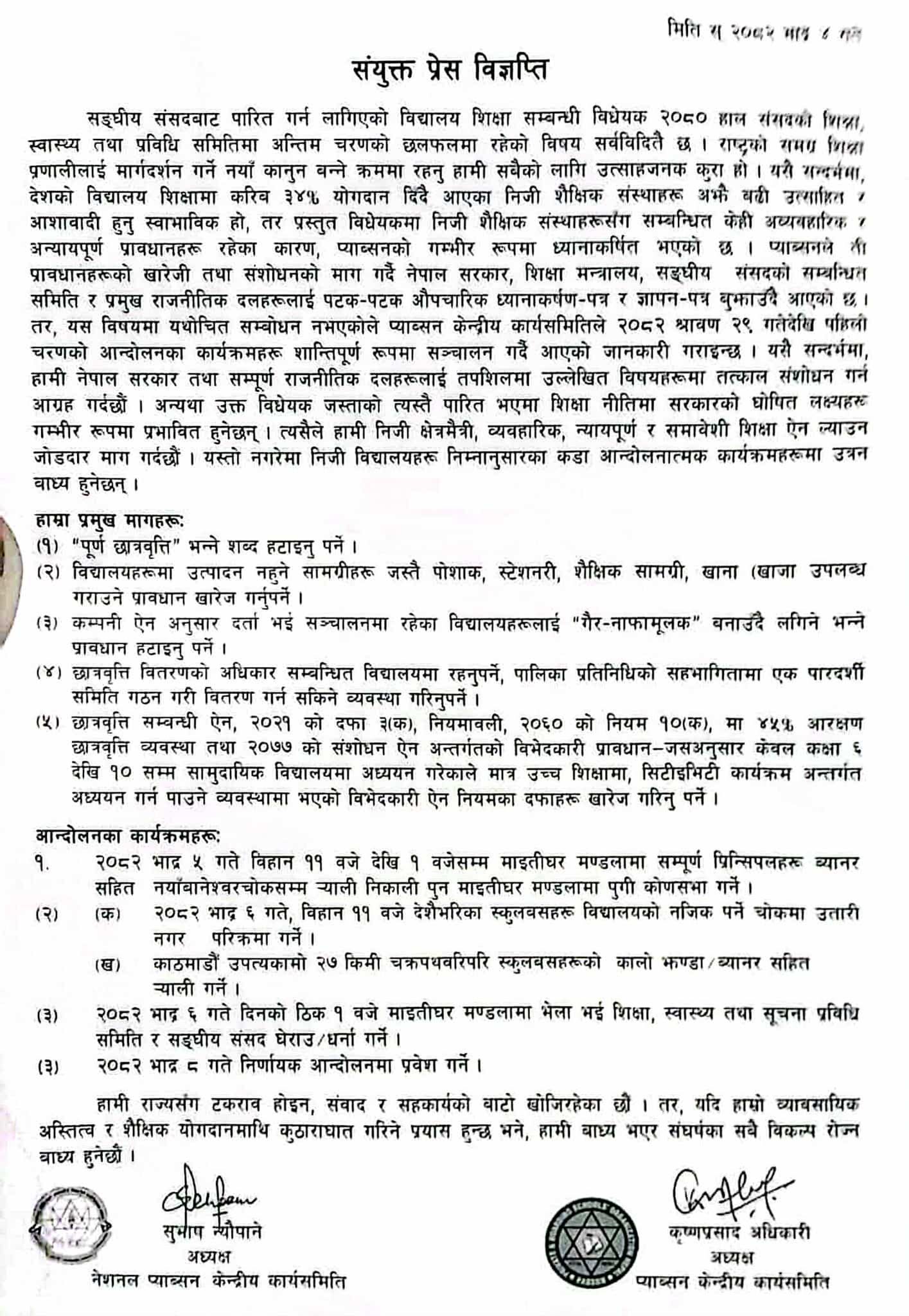 निजी विद्यालय सञ्चालकहरूको पाँचबुँदे प्रमुख माग
