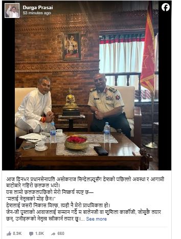 प्रसाईंले भने, “प्रधानसेनापति सिग्देलज्यूसँग देशको पछिल्लो अवस्था र आगामी बाटोबारे गहिरो छलफल भयो। यस लामो छलफलपछिको मेरो निष्कर्ष स्पष्ट छ– मलाई नेतृत्वको मोह छैन। देशलाई जसरी निकास मिल्छ, त्यही मेरो प्राथमिकता हो।”