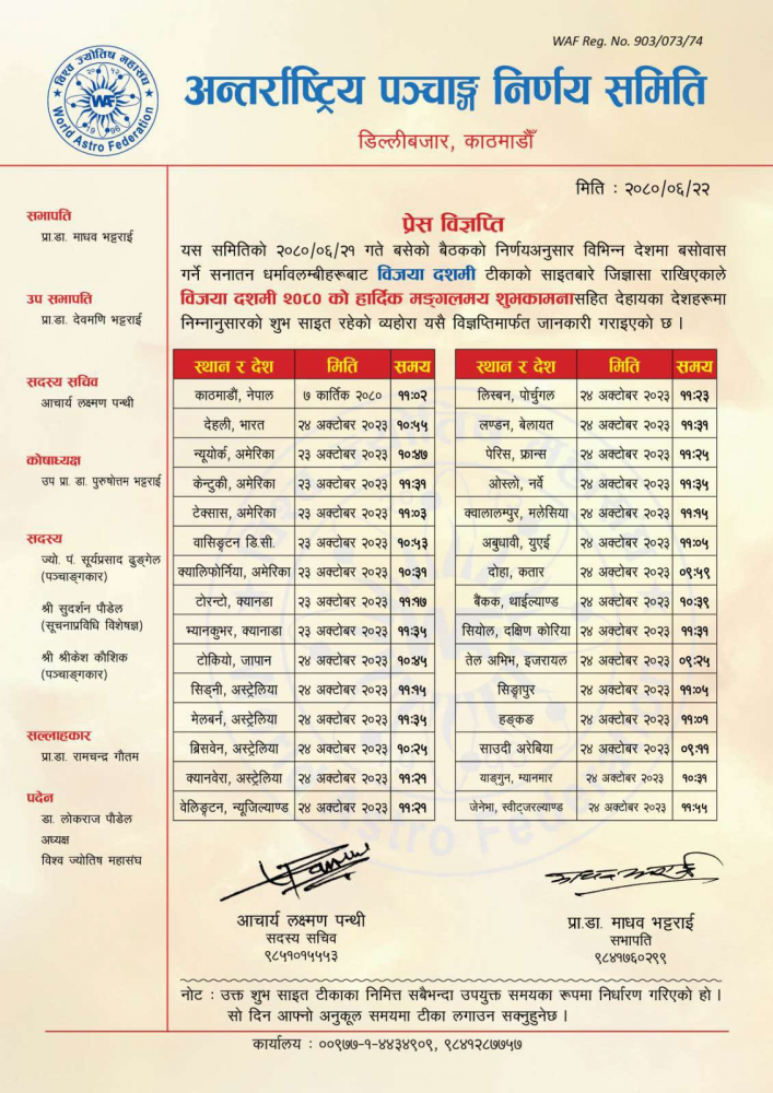 समितिका अनुसार नेपालमा कार्तिक ७ गते बिहान ११ बजेर २ मिनेटमा दसैँको टीका लगाउने उत्तम साइत छ ।
