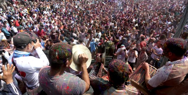 यद्यपि काठमाडौंको ऐतिहासिक एवं पर्यटकीय क्षेत्र बसन्तपुर दरबार क्षेत्रमा भने होलीको रौनक विशेष देखिएको छ। यहाँ भेला भएका स्वदेशी युवायुवती तथा विदेशी पर्यटकहरूले रंगीन उत्सवमा सहभागी हुँदै अबिर लगाउने, पानी छ्याप्ने र सांगीतिक धुनमा नाचगान गर्ने दृश्यले क्षेत्रलाई झनै जीवन्त बनाएको छ।