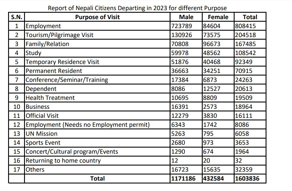 काठमाडौं । नेपालबाट सन २०२३ मा विभिन्न उदेश्यले १६ लाख तीन हजार, आठ सय ३६ जना वैदेशिक रोजगारी विदेश प्रस्थान गरेका छन् । सन २०२३ मा जम्मा ८ लाख ,८ हजार चार सय १५ जना नेपालीहरु रोजगारीका लागि काम गर्न विदेश गएका छन् ।विदेश जाने पुरुषको संख्या, ७ लाख,२३ हजार ७ सय ,८९ जना रहेको छन्, भने महिलाको संख्या ८४ हजार,६ सय,चार जना रहेको छ् । यस्तै पर्यटन तथा तिर्थ यात्राका लागि विदेश भ्रमणमा जम्मा २ लाख ४ हजार पाँच सय १८ जना रहेका छन् । जसमा पुरुष एक लाख ३० हजार नौ सय २६ रहेका छन् भने महिला ७३ हजार ५ सय ७५ जना रहेका छन् । यस्तै पारिवारी सम्बन्धमा स्थापित भएर एक लाख ६७ हजार ४ सय ८५ जनामा पुरुष सात हजार आठ सय आठ रहेका छन् भने महिला ९६ हजार ६ सय ७३ हजार रहेका छन् ।