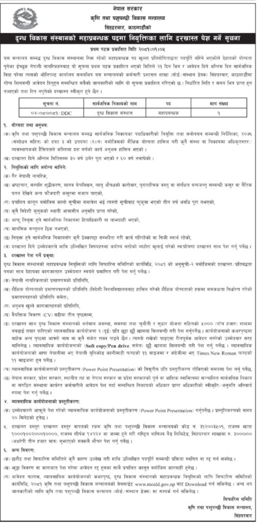 काठमाडौँ । दुग्ध विकास संस्थान (डिडिसी)ले महाप्रबन्धक नियुक्त गर्न दरखास्त आह्वान गरेको छ।