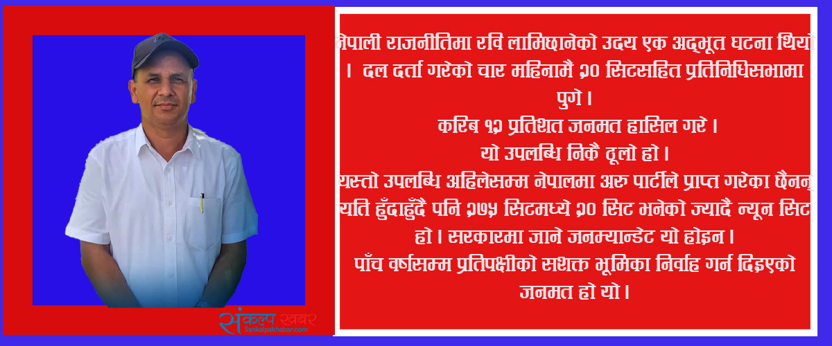 नेपाली राजनीतिमा रवि लामिछानेको उदय एक अद्भूत घटना थियो । दल दर्ता गरेको चार महिनामै २० सिटसहित प्रतिनिधिसभामा पुगे । करिब १२ प्रतिशत जनमत हासिल गरे । यो उपलब्धि निकै ठूलो हो । यस्तो उपलब्धि अहिलेसम्म नेपालमा अरु पार्टीले प्राप्त गरेका छैनन् । यति हुँदाहुँदै पनि २७५ सिटमध्ये २० सिट भनेको ज्यादै न्यून सिट हो । सरकारमा जाने जनम्यान्डेट यो होइन । पाँच वर्षसम्म प्रतिपक्षीको सशक्त भूमिका निर्वाह गर्न दिइएको जनमत हो यो ।