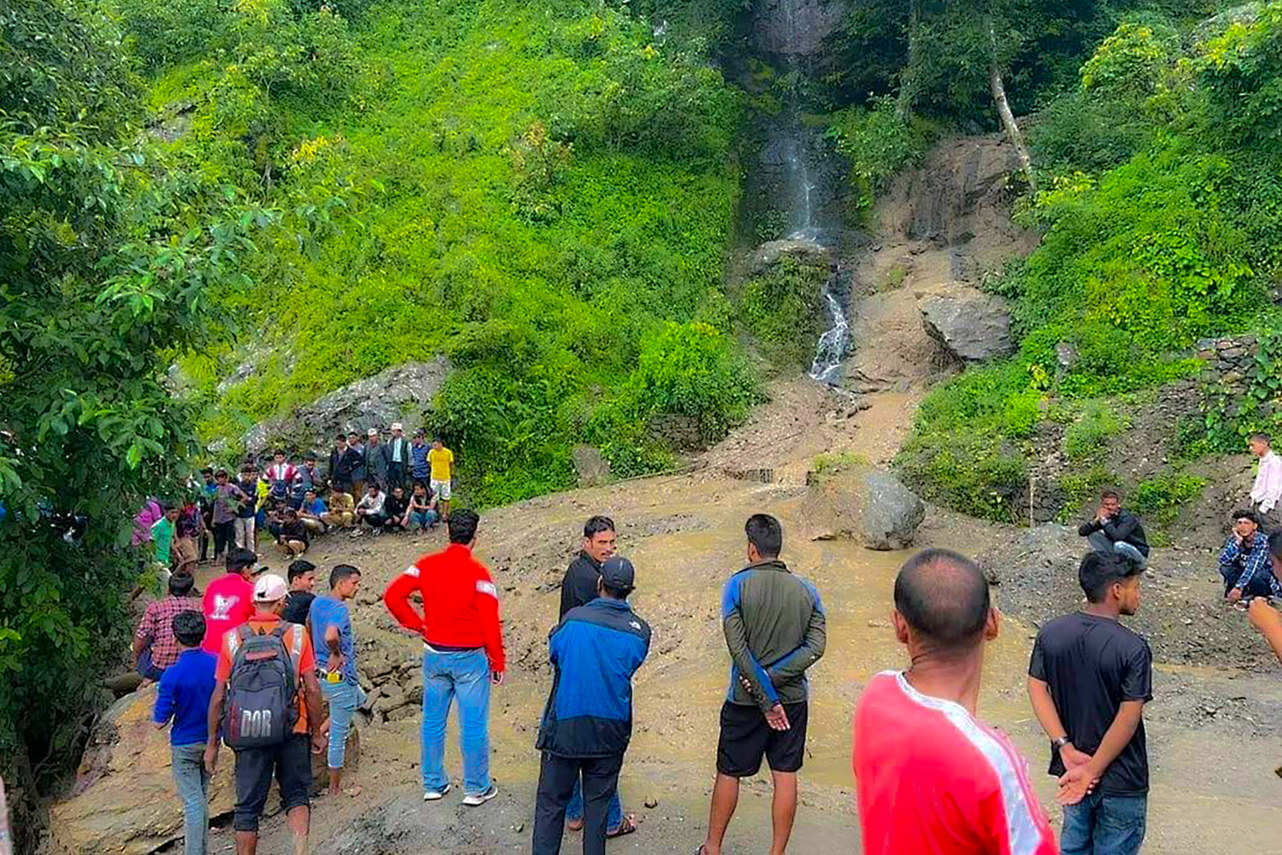 सुर्खेत– दैलेख सडकखण्ड अन्तर्गत माथिल्लो डुंगेश्वर–गुराँसेको बीचमा पर्ने सियाकोट नजिकै सडकमा खसेको पहिरो । पहिरो खसेपछि सडक पूर्णरुपमा अवरुद्ध भएको छ । तस्बिरः सुरेश आचार्य÷रासस
