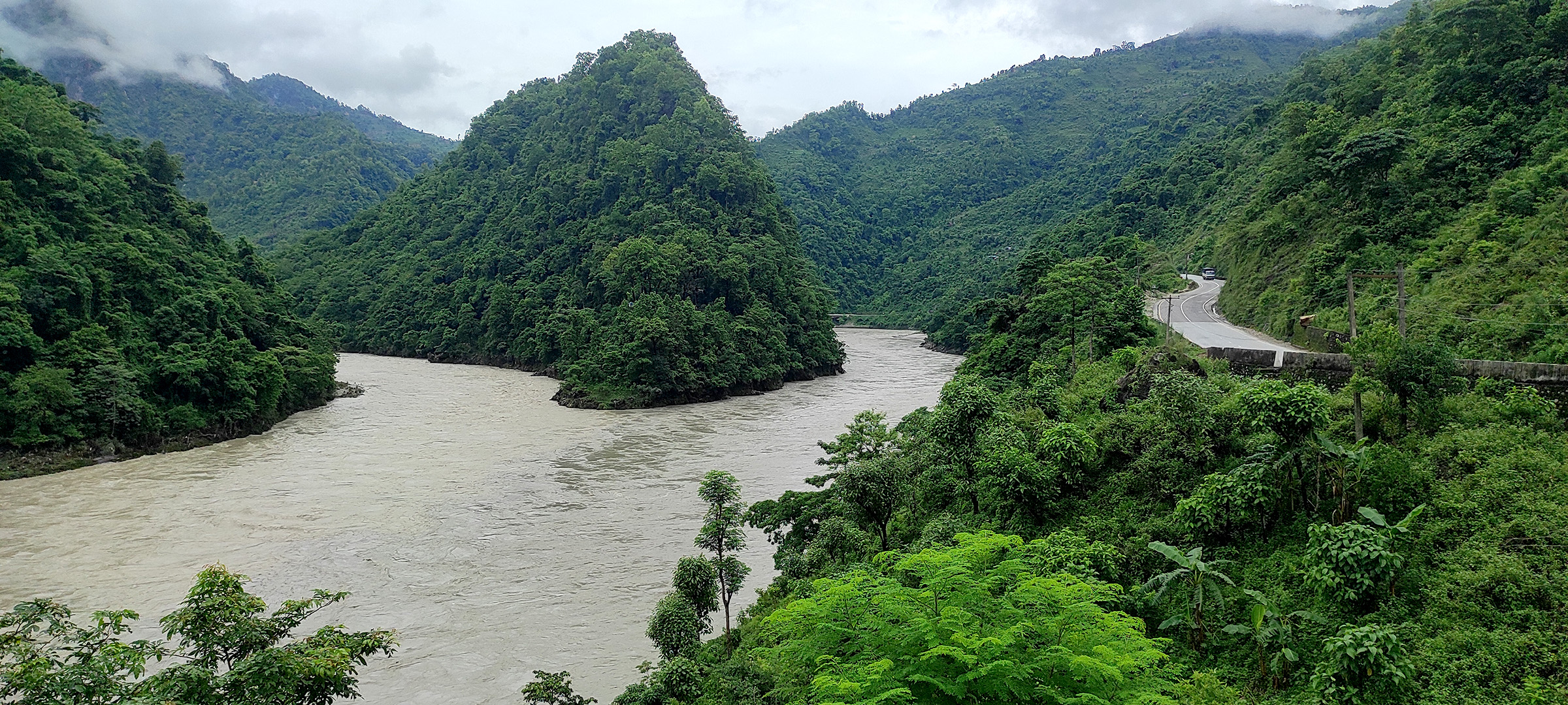 मनसुन सक्रिय भएपछि तनहुँको आँबुखैरेनी गाउँपालिका-५ र चितवनको भरतपुर महानगरपालिका-२९ गाईघाटस्थित मादी, सेती र त्रिशुलीनदीको सङ्गमस्थलमा बढेको पानीको सतह र आसपासका डाँडाकाँडाको हरियाली । तस्बिर : मिला दरै/रासस