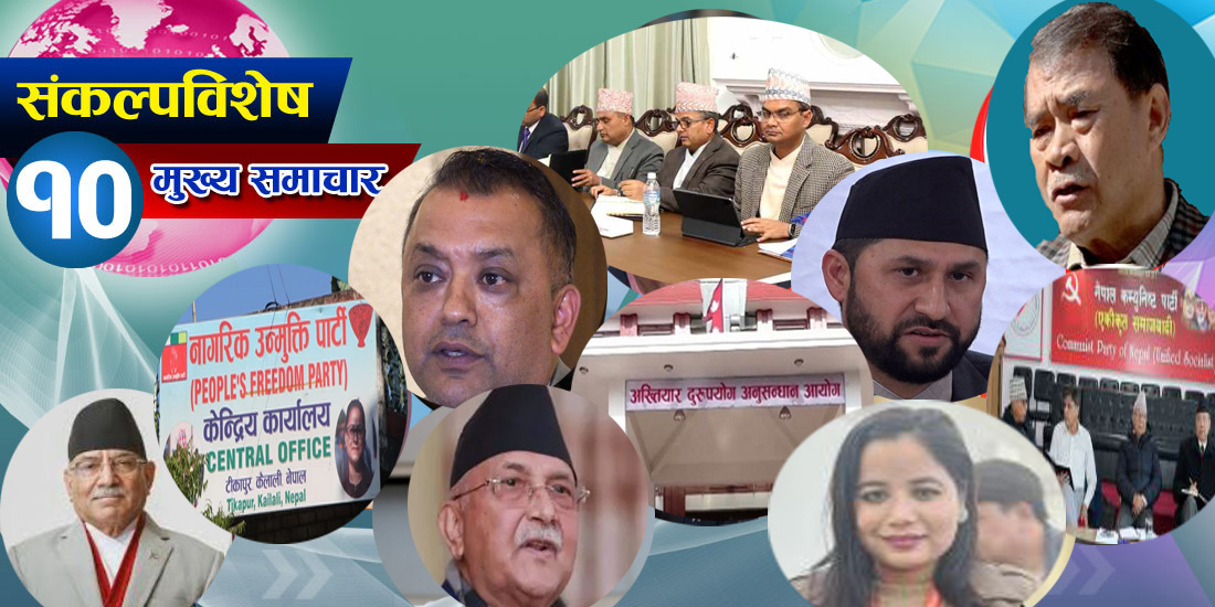 चैत्र १४ गते बुधबार संकल्प खबरले दिनभरी घटेका मुख्य १० मुख्य समाचार तयार पारेको छ । दिनभरी घटेका घटनालाई एक साथ हेर्न मिल्नेगरी संकल्प विशेष १० समाचारमा मुलुकमा घटेका मुख्य समाचारलाई समेटिएको हो । बुधबार तयार पारिएको मुख्य १० समाचारमामा महामन्त्री थापाले ‘संवाद यात्रा’ भोलीदेखि पुनः सुरु गर्दै देखि अनलाइन फार्मेसी सञ्चालन नगर्न निर्देशन सम्मका समाचार समेटिएको छ ।