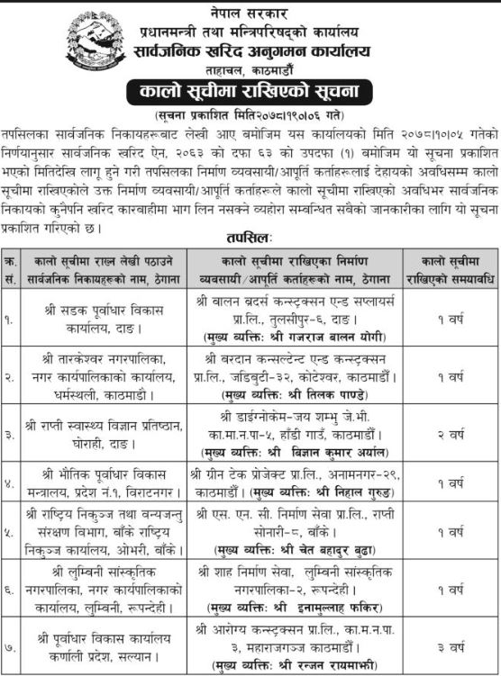 काठमाडौँ । प्रधानमन्त्री तथा मन्त्रीपरिषद् कार्यालय, सार्वजनिक खरिद अनुगमन कार्यालयले ७ वटा कम्पनिलाई कालो सूचीमा राखेको छ । ६ माघ देखि लागु हुने गरी अनुगमन कार्यालयले निमार्ण व्यावसायी र आपूर्तिकर्ताहरुलाई १ देखि ३ बर्षसम्म कालो सूचीमा राखेकाे हाे ।