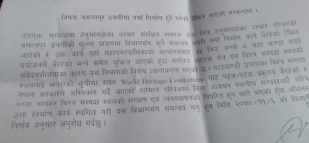 पुरातत्व विभागसँग समन्वय नगरी डबली भत्काएर महानगरले मनपरी ढंगबाट संरचना निर्माण गरेको भन्दै उक्त काम तत्काल रोक्न गत ६ फागुनमा महानगरलाई पत्र पठाएको थियो । तर, विभागको पत्रलाई बेवास्ता गर्दै महानगरले विश्व सम्पदा सूचीमा सूचीकृत वसन्तपुर डबलीमा कंक्रिटको संरचना निर्माण गरेको हो । त्यसपछि विभागले तत्काल काम रोक्न अर्को पत्र पठायो । दुईवटा पत्र पाइसकेको महानगरले त्यसको बेवास्ता गर्दै संरचना तयार पारेको हो ।