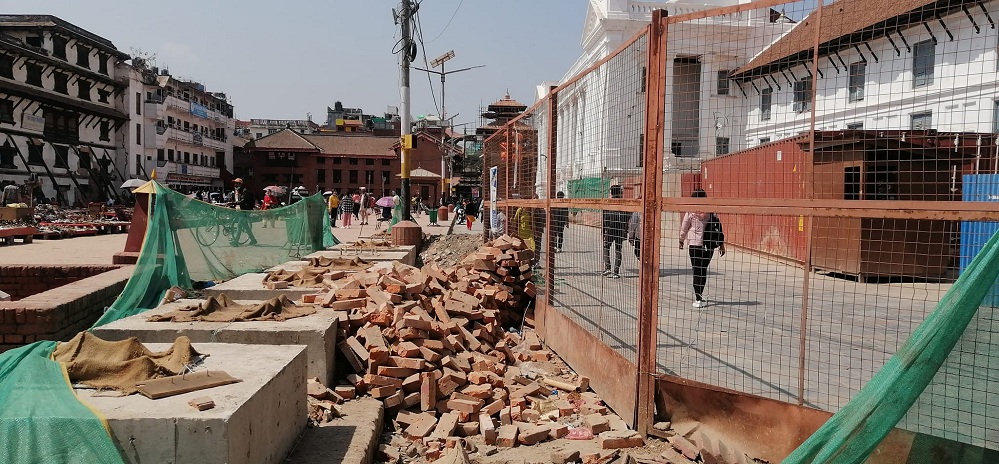 विश्व सम्पदा सूचीमा सूचीकृत हनुमानढोका दरबार क्षेत्रमा यसरी कंक्रिट र सिमेन्टको प्रयोग गरेर संरचना बनाउन पाइँदैन । तर, काठमाडौं महानगरपालिका प्रमुख विद्यासुन्दर शाक्यको ठाडो निर्देशनमा झन्डा राख्नसंरचना निर्माण भइरहेको हो ।
