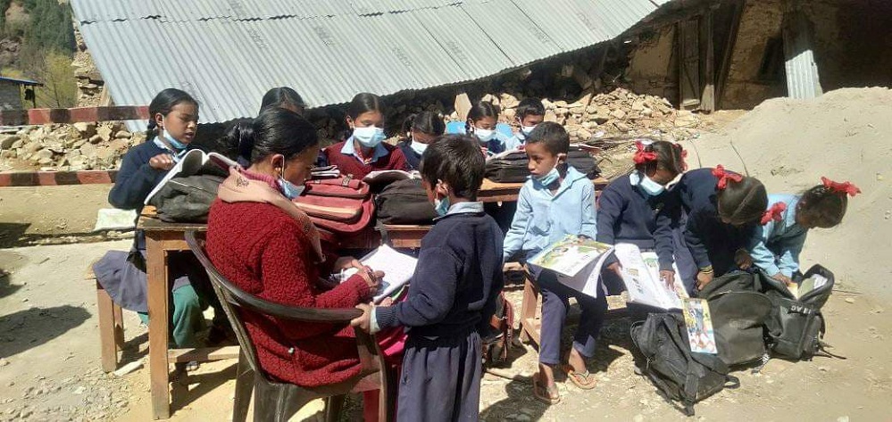 जुम्ला । जुम्लाको कनकासुन्दरी गाउँपालिका-३ गौरीगाउँमा रहेको नवदुर्गा आधारभूत विद्यालयका विद्यार्थी खुला चौरमा पढ्न बाध्य छन् । विद्यालयमा कक्षा कोठा नहुँदा विद्यार्थी उनीहरू चौरमै बसेर पढ्न बाध्य भएका हुन् । उनीहरू हिउँदको कठ्याग्रिँदो जाडोमा समेत चौरमै बसेर पढिरहेका हुन्थे ।