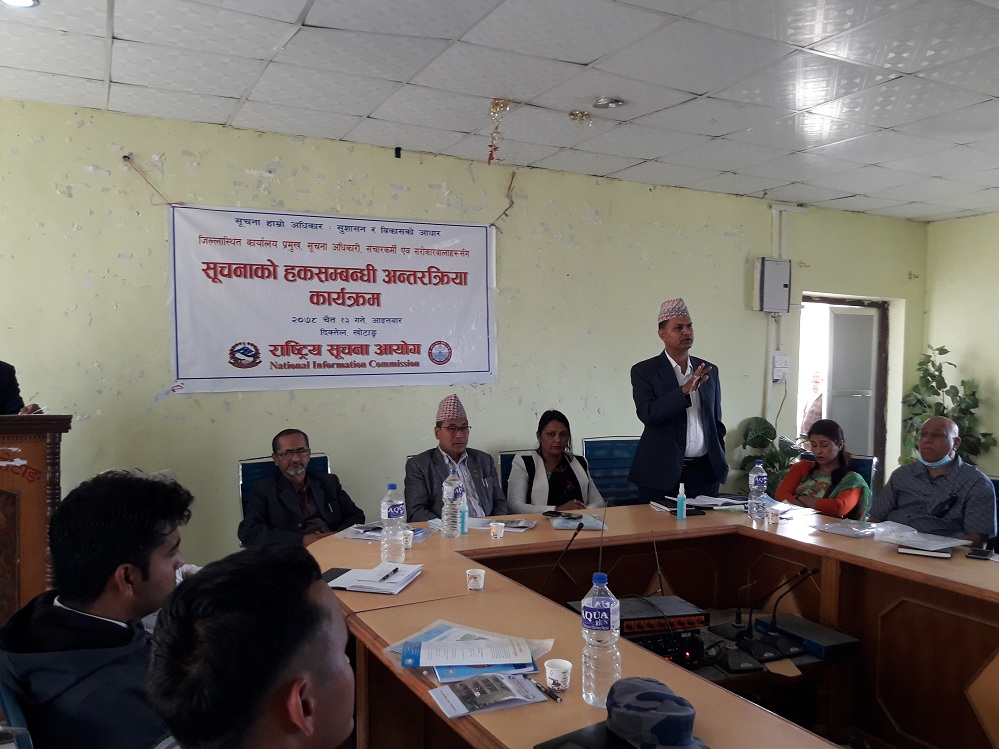 खोटाङ । राष्ट्रिय सूचना आयोगले सबैभन्दा बढी स्थानीय तहबाट सूचनाको हक कार्यान्वयन नभएको पाइएको जनाएको छ । आयोगले आइतबार दिक्तेलमा आयोजना गरेको सूचनाको हक र यसको कार्यान्वयनः अन्तरक्रिया कार्यक्रममा आयोगका सचिव भागिरथ पाण्डेयले माग गरेको सूचना नपाएको भन्दै सबैभन्दा बढी उजुरी स्थानीय तह विरुद्ध परेको जानकारी दिए ।