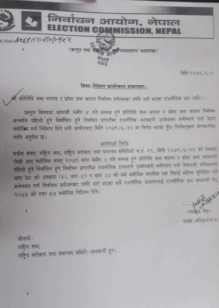 जसअनुसार प्रतिनिधिसभा र प्रदेशसभा निर्वाचनमा प्रत्यक्षतर्फ कम्तीमा एकतिहाइ महिला लक्षित गरी मनोनयन दर्ता गर्न राजनीतिक दल सम्बन्धी ऐन २०७३ को दफा ५७ बमोजिम निर्देशन गरिएको हो ।