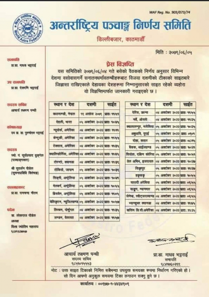 विभिन्न देशमा बसोबास गर्ने सनातन धर्मावलम्बीहरुबाट विजया दशमीको टीकाको साइतबारे जिज्ञासा राखेकोले स्थानीय समयसहित आफूहरुले साइतबारे जानकारी दिएको समितिले जारी गरेको विज्ञप्तिमा उल्लेख छ ।