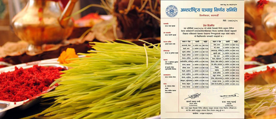 विभिन्न देशमा बसोबास गर्ने सनातन धर्मावलम्बीहरुबाट विजया दशमीको टीकाको साइतबारे जिज्ञासा राखेकोले स्थानीय समयसहित आफूहरुले साइतबारे जानकारी दिएको समितिले जारी गरेको विज्ञप्तिमा उल्लेख छ ।