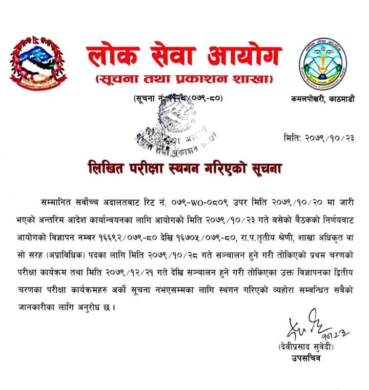 आयोगले माघ १० गते तोकेको प्रथम चरण र चैत २१ गतेदेखि सञ्चालन हुने भनेको दोस्रो चरणको परीक्षा अर्को सूचना जारी नहुँदासम्मका लागि स्थगन गरेको जनाएको छ ।