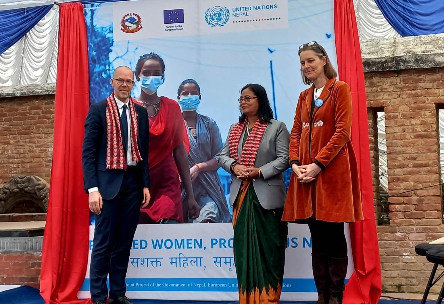‘सशक्त महिला, समृद्ध नेपाल’ नाम दिइएको चार वर्षे संयुक्त राष्ट्रिय कार्यक्रम आज ललितपुरको पाटनमा आयोजित विशेष समारोहमा शुभारम्भ गरिएको हो । उक्त कार्यक्रम महिला, बालबालिका तथा ज्येष्ठ नागरिकमन्त्री भगवती चौधरी, युरोपियन युनियनको अन्तर्राष्ट्रिय साझेदारीका निर्देशक पेटेरिस उस्टुब्स र युनिसेफ नेपालका प्रतिनिधि एल्के विस्चले संयुक्त रुपमा शुभारम्भ गरेका हुन् ।
