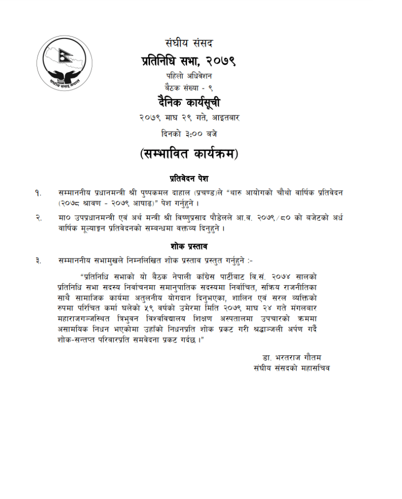 यस्तै उपप्रधान एवं अर्थमन्त्री विष्णुप्रसाद पौडेलले आ.व. २०७९–८० को बजेटको अर्धवार्षिक मूल्यांकन प्रतिवेदनको सम्बन्धमा वक्तव्य दिनेछन् भने सभामुख देवराज घिमिरेले शोक प्रस्ताव पनि प्रस्तुत गर्ने सम्भावित कार्यसूची रहेको छ ।
