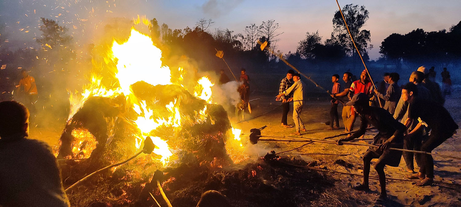 कञ्चनपुर । कञ्चनपुरको शुक्लाफाँटा नगरपालिका–३ पिपलाडीका थारु समुदायका अगुवा लहानु चौधरी होली पर्वका अवसरमा गाउँको देउथानमा आगो बाल्नमा व्यस्त छन् ।