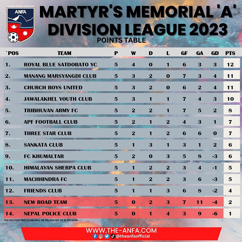 अहिलेसम्म ए डिभिजन लिगमा पाँच चरणका खेल सम्पन्न हुदा सातदोबाटो युथ क्लब १२ अंकसहित शिर्ष स्थानमा रहेको छ । त्यस्तै मनाङ मर्स्याङ्दी क्लब र चर्च ब्वाइज ११-११ अंकसहित दोस्रो र तेस्रो स्थानमा रहेका छन् । त्यस्तै १० अंकसहित जावलाखेल युथ क्लब चौथो स्थानमा रहेको छ ।