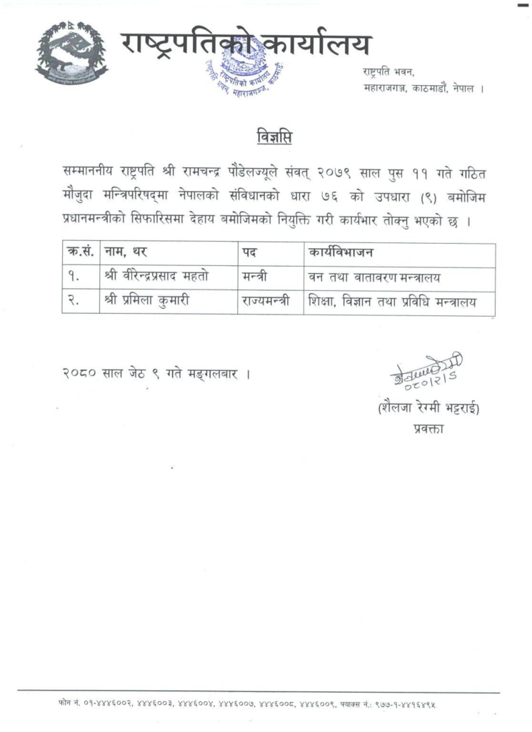 मंगलबार प्रधानमन्त्री प्रचण्डको सिफारिसमा राष्ट्रपति रामचन्द्र पौडेलले जसपाका डा.वीरेन्द्रप्रसाद महतोलाई वन तथा वातावरण र प्रमिलाकुमारी यादवलाई शिक्षा, विज्ञान तथा प्रविधि राज्यमन्त्री नियुक्त गरेको राष्ट्रपति कार्यालयले जानकारी दिएको छ ।