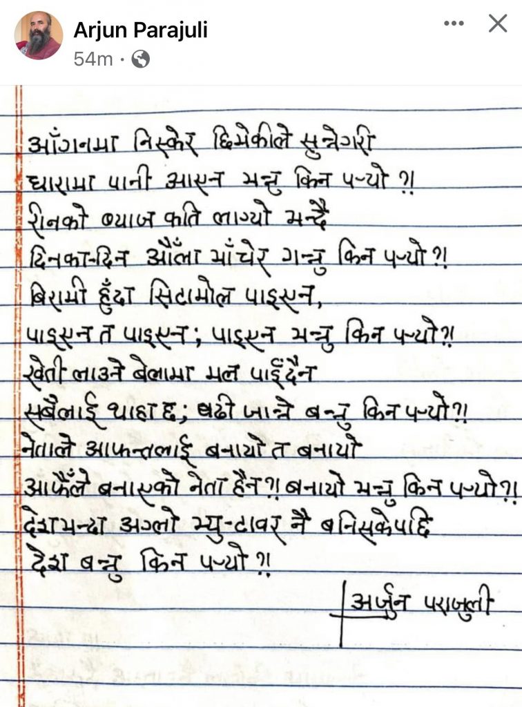 काठमाण्डाैं। ब्यग्य कवितामा राम्राे ख्याति कमाएका कवि अर्जुन पराजुलीले भ्यु टावरकाे वारेमा वेजाेडकाे कविता लेखेका छन।उनले नेपाल कुन मनाेदशबाट गुज्रिएकाे छ भनेर कविता मार्फत पस्किएका छन।उनकाे कविता यस्ताे छ।