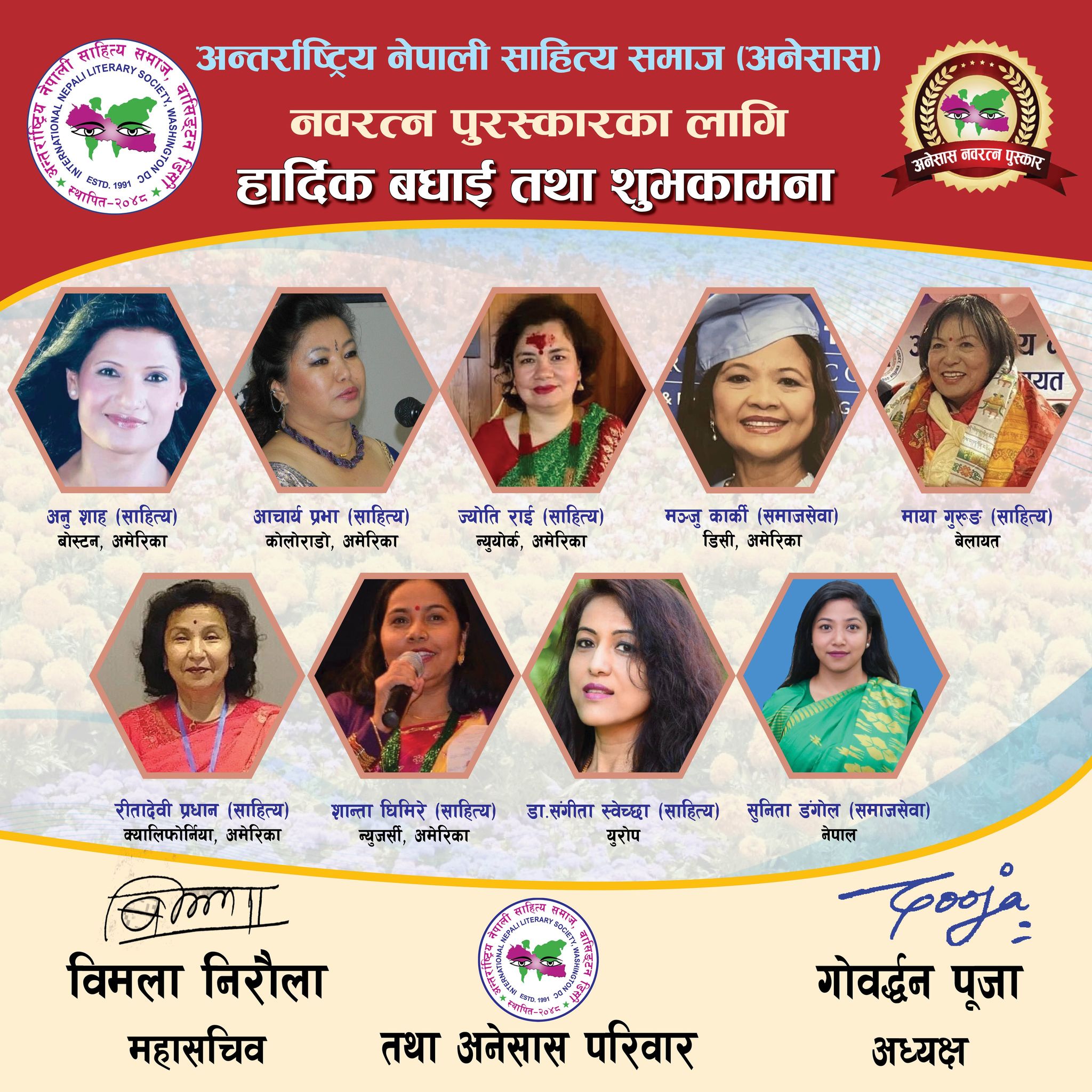 समितिको निर्णयअनुसार अनु शाह (साहित्य(बोस्टन), आचार्य प्रभा (साहित्य–कोलोराडो), ज्योति राई (समाजसेवा–न्यूयोर्क), मञ्जु कार्की संग्रौला (डिसी(समाजसेवा),माया गुरूङ् ( साहित्य – बेलायत),रीतादेवी प्रधान (क्यालिफोर्निया– साहित्य),शान्ता घिमिरे –न्यूजर्सी( साहित्य), डा. संगीता स्वेच्छा(साहित्य–बेलायत) र सुनिता डंगोल (उपमेयर) – काठमाडौं, समाजसेवा रहेका छन् । हालसम्म उक्त पुरस्कारबाट ४५ जना महिला सम्मानित भइसकेका छन् ।
