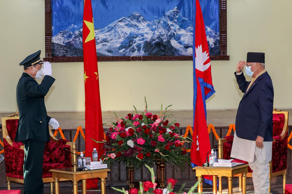 काठमाडौं। एक दिने भ्रमणका लागि आइतबार काठमाडौ आएका उत्तरी छिमेकी मुलुक चीनका स्टेट काउन्सिलर तथा रक्षामन्त्री वेई फेङ्हेले बालुवाटारमा प्रधानमन्त्री केपी शर्मा ओलीसँग शिष्टाचार भेट गरेका छन्।