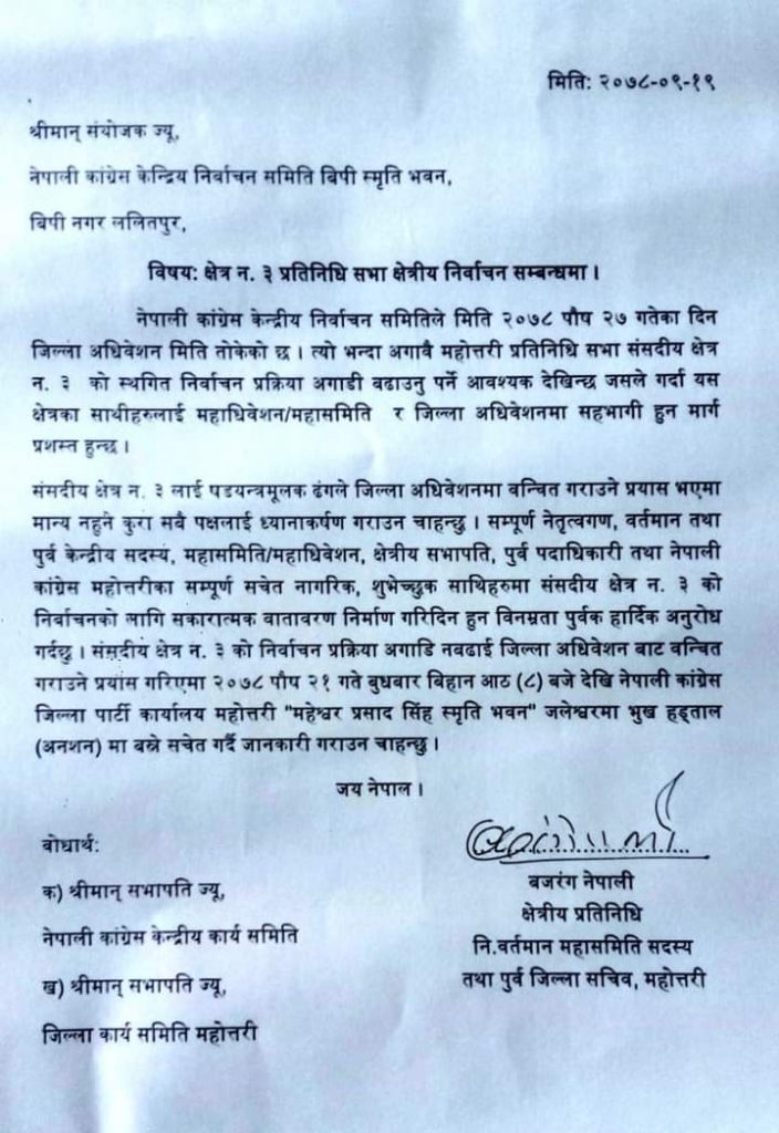 मंगलवार जिल्ला कार्यसमितिले केन्द्रलाई नेता नेपालीको भोक हडतालप्रति ध्यानाकर्षणसहितको पत्र समेत पठाइसकेको छ । पत्रमा क्रियाशील सदस्य तथा अधिवेशनमा भाग लिनेहरुलाई पाखा लगाइ जिल्ला अधिवेशनको मिति तोक्नु षडयन्त्रपूर्ण र सुनियोजित भएको उल्लेख छ ।