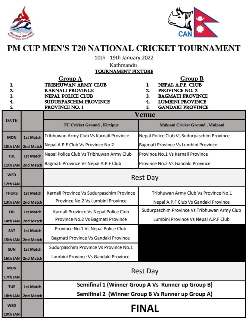काठमाडौं।प्रधानमन्त्री कप (पीएम)ट्वान्टी २० क्रिकेट प्रतियोगिताको खेल तालिका सार्वजनिक भएको छ ।