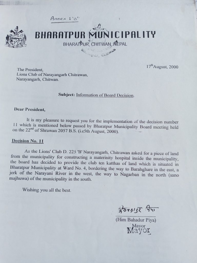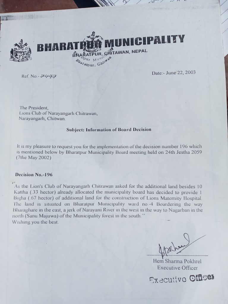 लायन्स प्रसूति गृह निर्माणको लागि लायन्स क्लब अफ नारायणगढ चित्रवनले तत्कालीन भरतपुर नगरपालिकासँग जग्गा माग गरेको थियो । नगरपालिकाको २२ साउ २०५७ को बोर्ड बैठकले क्लबलाई प्रसूति गृह बनाउन नगरवनको १० कठ्ठा जग्गा दिने निर्णय गरेको हो ।
