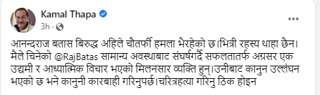 बतास समूहका अध्यक्ष आनन्दराज बतासविरुद्ध अहिले चौतर्फी आक्रमण भइरहेको भन्दै आइतबार बिहान ७ः३४ बजे थापाले सामाजिक सञ्जाल फेसबुकमा लेखेका छन्, ‘आनन्दराज बतासविरुद्ध अहिले चौतर्फी हमला भइरहेको छ । भित्री रहस्य थाहा छैन । मैले चिनेको आनन्दराज बतास सामान्य अवस्थाबाट संघर्ष गर्दै सफलतातर्फ अग्रसर एक उद्यमी र आध्यात्मिक विचार भएको मिलनसार व्यक्ति हुन् । उनीबाट कानुन उल्लंघन भएको छ भने कानुनी कारबाही गरिनुपर्छ । चरित्रहत्या गरिनु ठिक होइन ।’