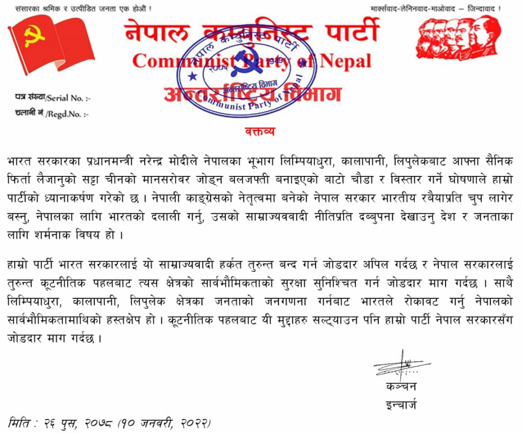 भारत सरकारका प्रधानमन्त्री नरेन्द्र मोदीले नेपालका भूभाग लिम्पियाधुरा, कालापानी, लिपुलेकबाट आफ्ना सैनिक फिर्ता लैजानुको सट्टा चीनको मानसरोवर जोड्न बलजफ्ती बनाइएको बाटो चौडा र विस्तार गर्ने घोषणाले हाम्रो पार्टीको ध्यानाकर्षण गरेको छ । नेपाली कांग्रे्रेसको नेतृत्वमा बनेको नेपाल सरकार भारतीय रवैयाप्रति चुप लागेर बस्नु, नेपालका लागि भारतको दलाली गर्नु, उसको साम्राज्यववादी नीतिप्रति दब्बुपना देखाउनु देश र जनताका लागि शर्मनाक विषय हो ।
