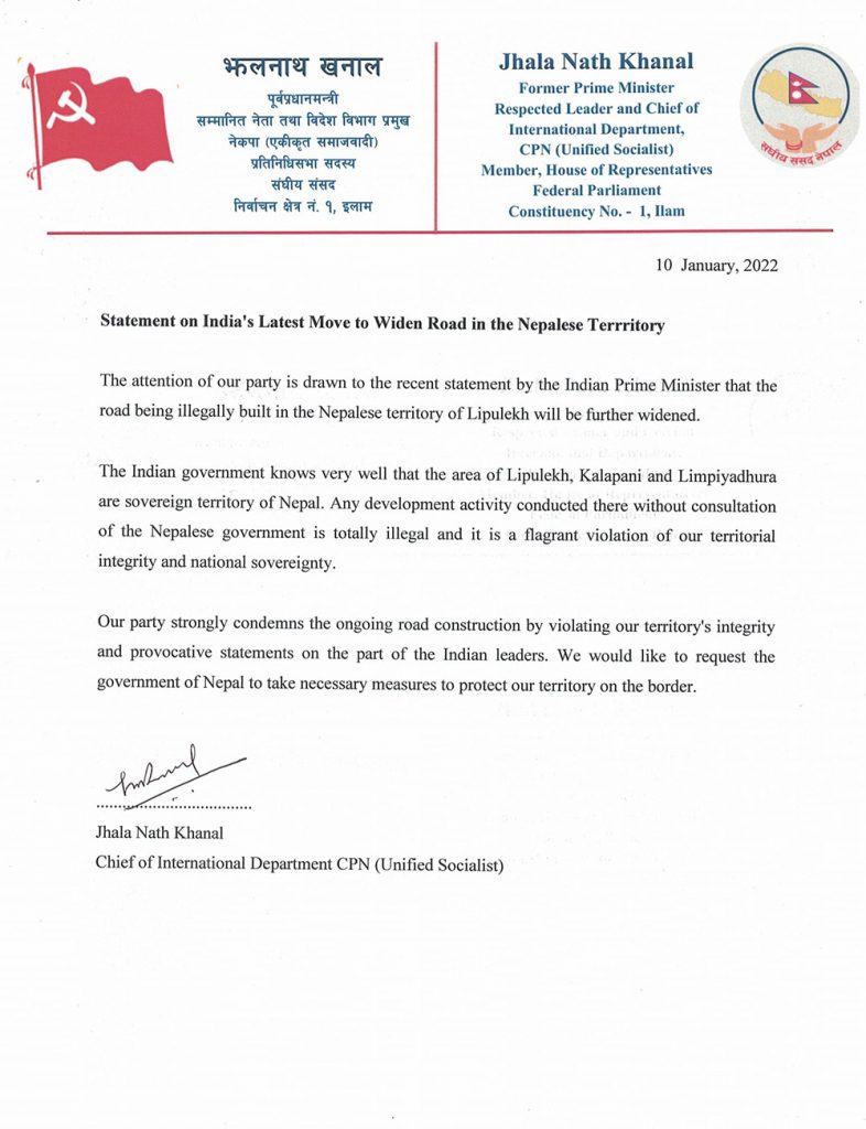 काठमाडौं । नेकपा (एकीकृत समाजवादी) ले नेपाली भूमि लिम्पायाधुरा–लिपुलेक क्षेत्रमा सडक बनाउनु अवैधानिक भएको बताएको छ ।