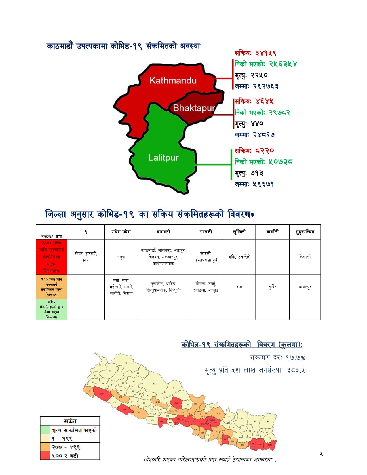 हाल काठमाडौँ उपत्यकामा कुल ४७०२४ सक्रिय संक्रमित रहेका छन् । जसमा काठमाडौँमा ३४१५९ जना, ललितपुरमा ८२२० जना र भक्तपुरमा ४७०२४ जना सक्रिय संक्रमित रहेका छन् ।