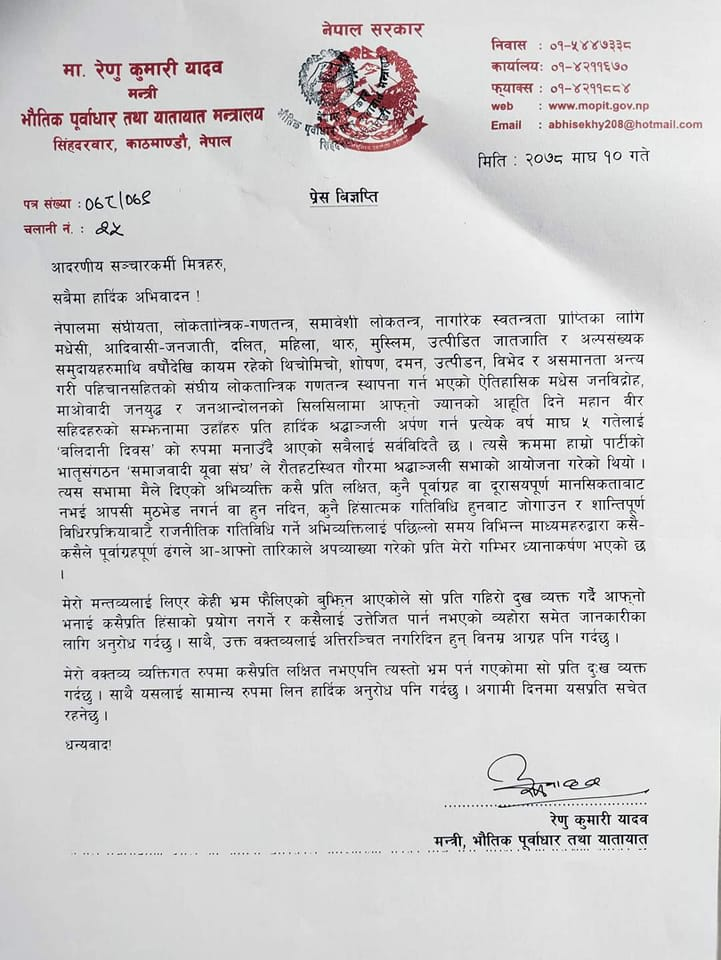 काठमाडौं।जनता समाजवादीकी नेतृ तथा भौतिक पूर्वाधार तथा यातायातमन्त्री रेणु यादवले आफ्नो अभिव्यक्तिलाई पूर्वाग्रहपूर्ण ढंगले आआफ्नो तारिकाले अपव्याख्या गरेकोप्रति गम्भीर ध्यानाकर्षण भएको बताएकी छन् ।