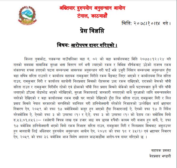 वडा सचिव सरिता राउत, रामकुमार गिरी र कार्यालय सहयोगी निलप्रसाद मिश्रविरुद्ध सार्वजनिक सम्पत्ति हानि–नोक्सानी गरी भ्रष्टाचार गरेको अभियोग लगाउँदै शुक्रबार विशेष अदालतमा मुद्दा दायर भएको हो । गतवर्ष चैत २४ मा रातको समयमा सामाजिक सुरक्षा भत्ता वितरण गर्न ल्याएको रकम र संकलित राजस्व रकम हराएको थियो । त्यसरी शंकास्पद रुपमा हराएपछि आयोगले अनुसन्धान गरी ‘हिनामिना’ भएको ठहर गरेको हो ।