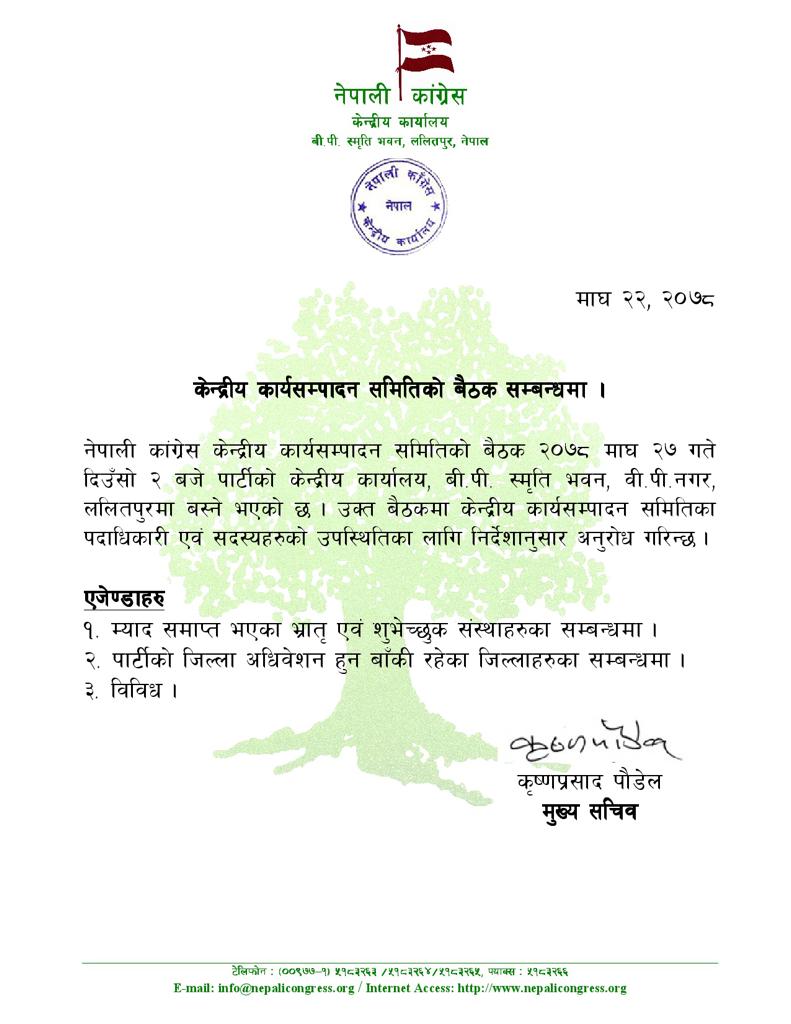 यस वैठकमा भ्रातृसंस्थाकाे चुनाव र स्थगीत भएकाे जिल्लाकाे अधिवेशनकाे वारेमा विमर्श हुनेछ।शनिवार पार्टी कार्यालयका मुख्य सचिव कृष्ण प्रसाद पाैडेलले विजज्ञप्ति जारी गरेर माघ २७ गते कार्यसम्पादन समितिकाे वैठक डाकेकाे खवर सार्वजनिक गरेका छन।