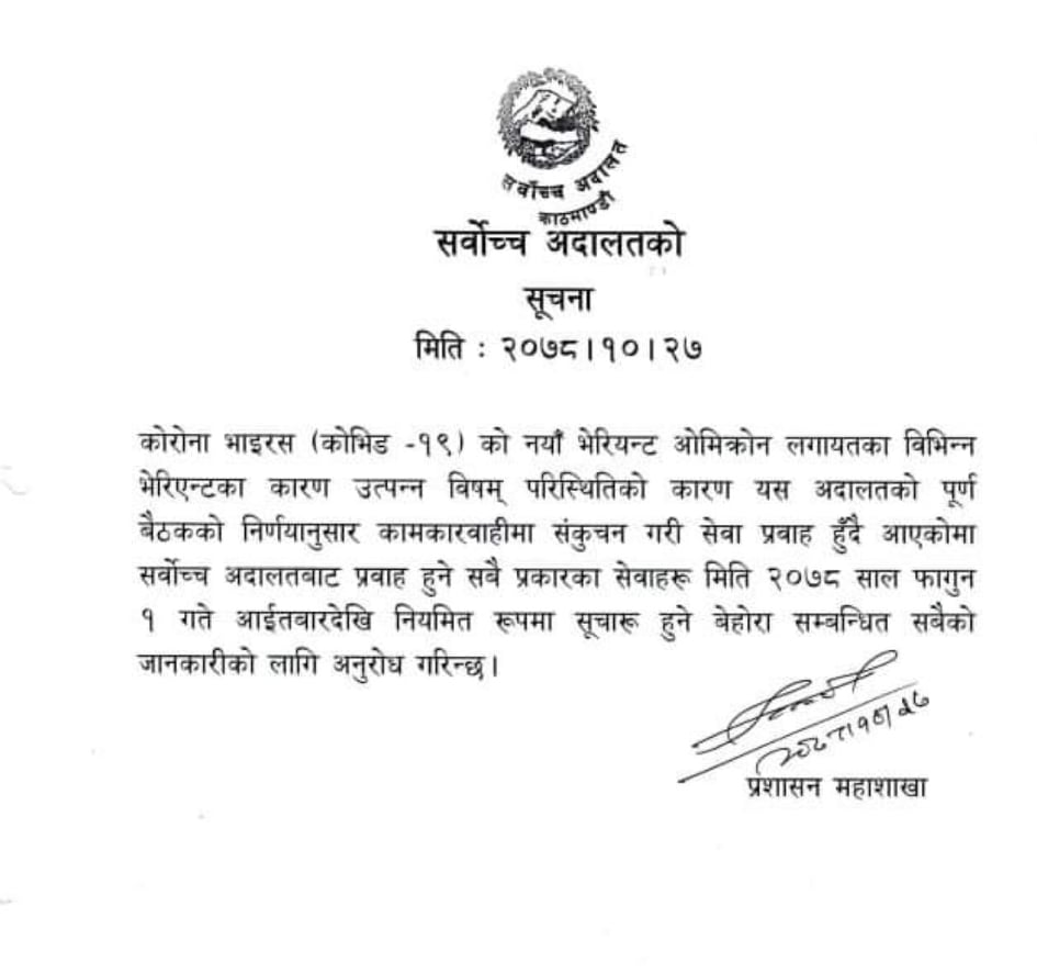काठमाडौं । कोरोनाका कारण रोकिएका सर्वोच्च अदालतका सम्पूर्ण किसीमका काम कारवाही फागुन १ देखि पूर्ण रुपमा सञ्चालनमा आउने भएका छन् । सर्वोच्चले बिहीबार एक सूचना निकाली सो बारे जानकारी दिएको हो । उक्त सूचनामा फागुन १ देखि सर्वोच्च अदालतबाट प्रदान हुने सबै किसीमका सेवाहरु सञ्चालन हुने उल्लेख छ ।