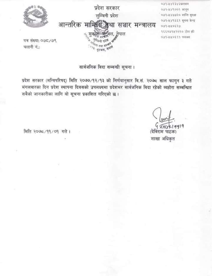 १३ चैत २०७७ को लुम्बिनी मन्त्रिपरिषद् बैठकको निर्णयअनुसार ३ फागुनमा लुम्बिनी प्रदेशभर सार्वजनिक बिदा दिइएको आन्तरिक मामिला तथा सञ्चार मन्त्रालयले आइतबार जारी गरेको विज्ञप्तिमा उल्लेख छ ।