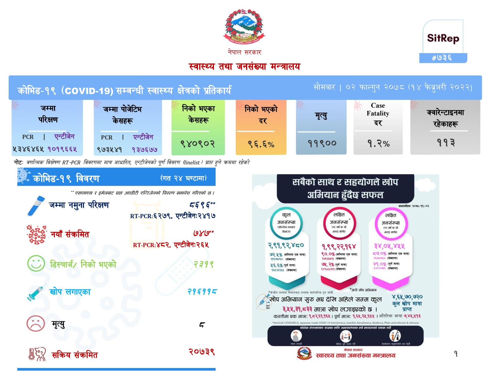 त्यस्तै पछिल्लो २४ घण्टामा २३१९ जना संक्रमण मुक्त भएका छन् । नेपालमा कोरोना निको हुने प्रतिशत ९६.६ रहेको मन्त्रालयले जनाएको छ ।
